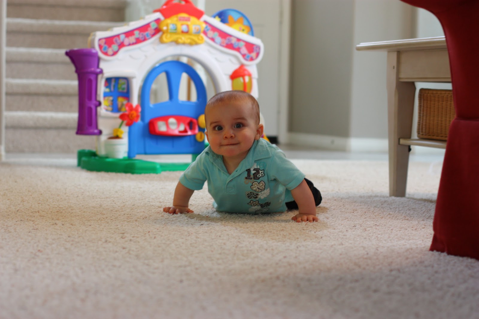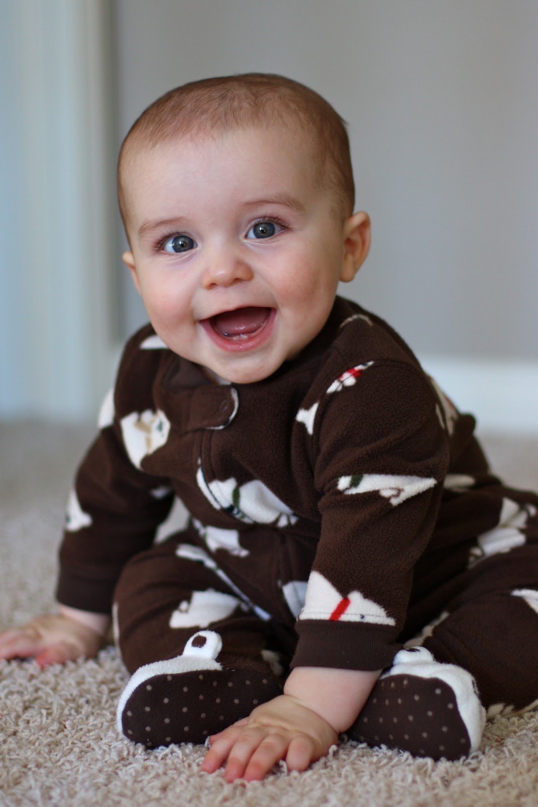 Way cute post! He is so adorable! You are so LUCKY and I’m totally jealous that he isn’t crawling or close to walking yet!! Travis is already crawling all over and actually walking along furniture and his little walking toy already!! He’s only 8 months old!! I just want him to stop and take it slowly!! But it’s just not happening for me!