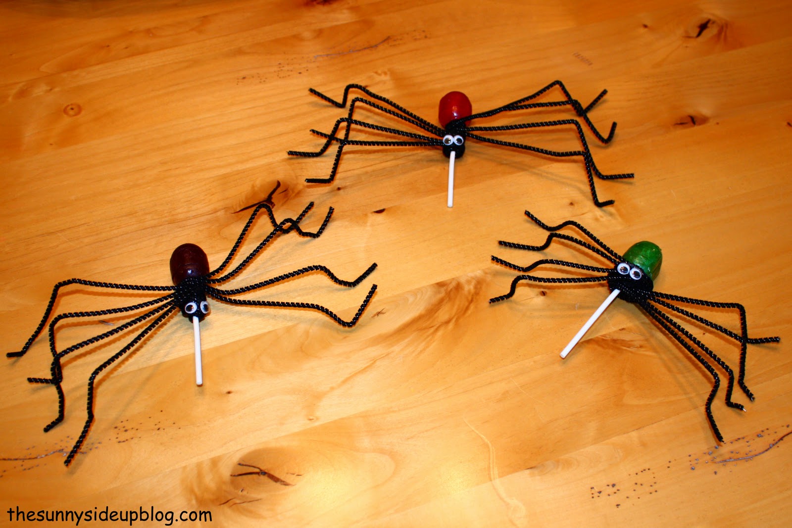 First up – our spooky spiders. My girls and I love blow pop suckers so this is a fun little treat we like to make. Very simple. You just need suckers, googly eyes, and pipe cleaners. You can find the full directions here.